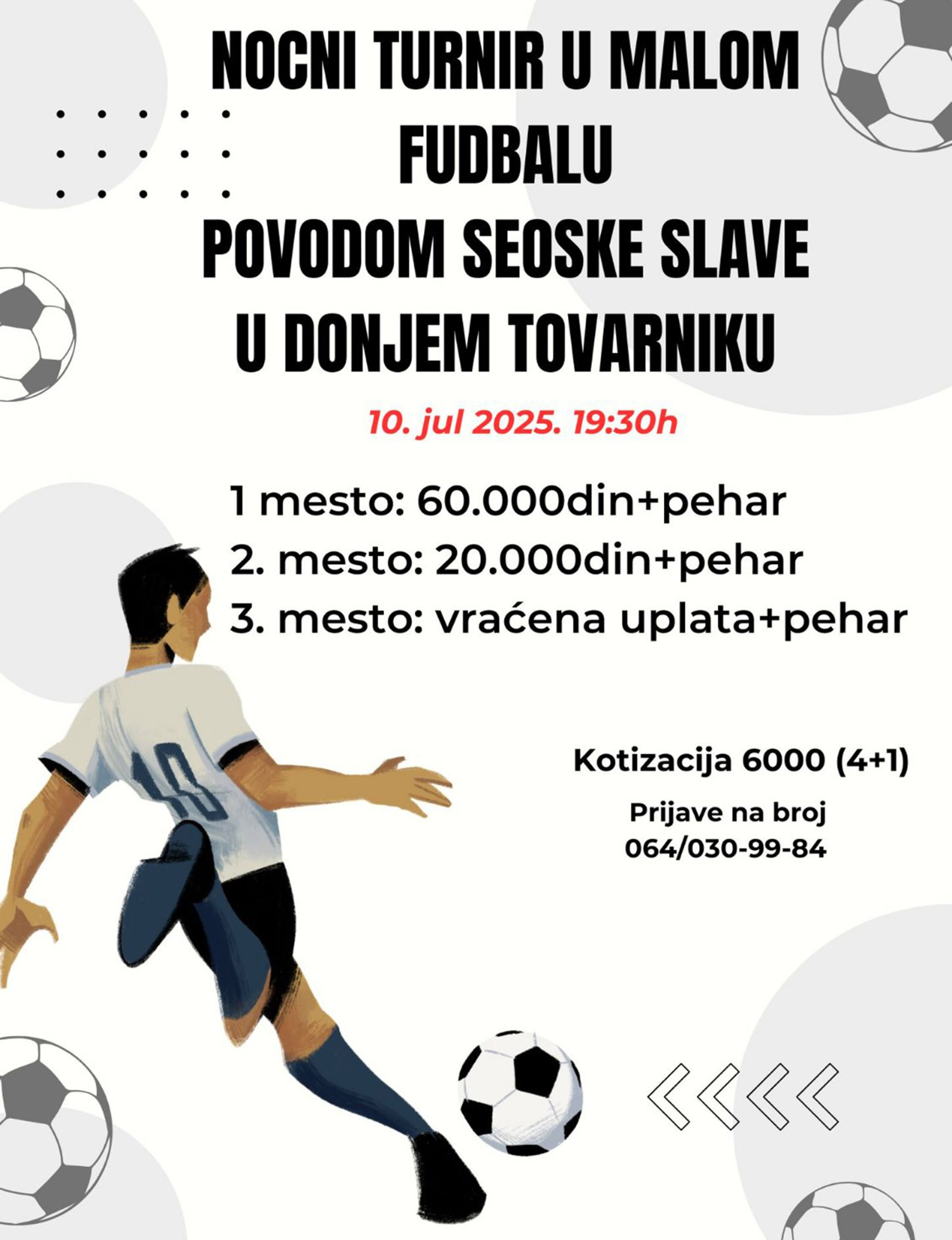 Нешто мало касније, у четвртак, 10. јула, од 19.30 часова, биће организован ноћни турнир у малом фудбалу. Котизација износи 6000 динара (4+1), а пријаве се врше путем броја телефона 064/03 09 984 (Јеленко).