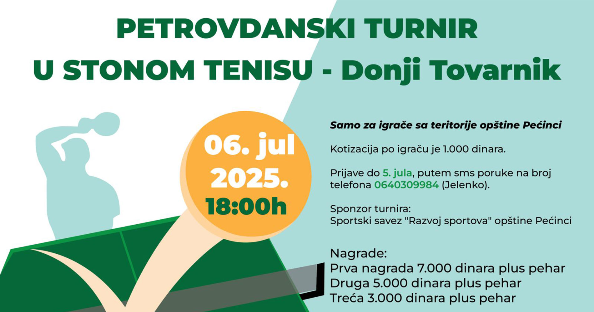 Поводом сеоске славе у Доњем Товарнику, у Спортској хали, у недељу 6. јула, у 18.00 часова, биће одржан Петровдански турнир у стоном тенису, у организацији Спортског савеза „Развој спортова“ а под покровитељством Општине Пећинци.